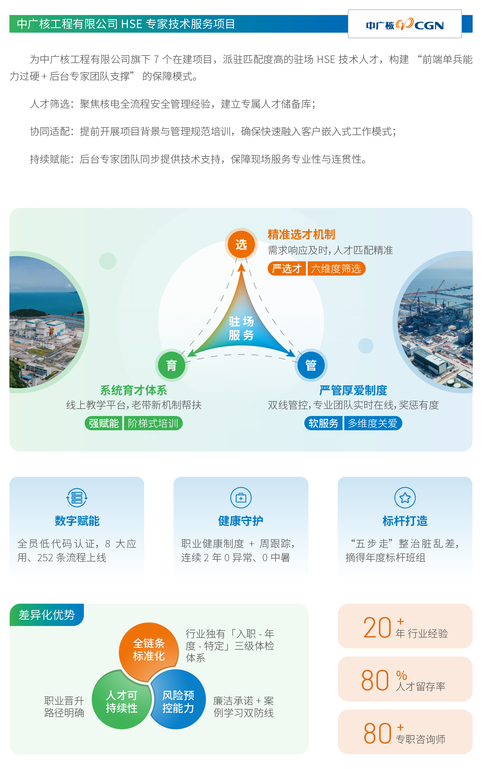 1.核心解决 HSE 专业技术落地难题:精准匹配核电等行业企业的 HSE 技术核心需求,通过专家团队全流程技术介入,将行业高标准、专业方案转化为企业可落地的实操能力,解决单纯人员补充无法实现的技术落地痛点,契合中广核等头部企业的合作诉求。