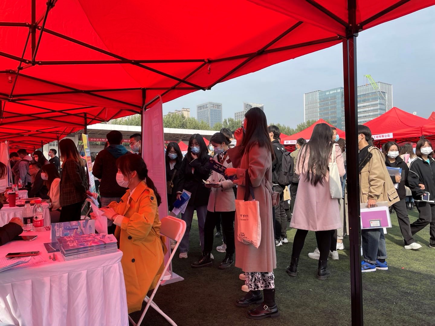 展位前挤满了即将毕业的学生,招聘小组合理分工,招聘组员向现场毕业生发放公司的宣传页,简要介绍了公司的企业文化、经营理念、公司概况、发展历程、组织架构和主营业务等相关信息,并说明有关人才培养以及人才需求和福利待遇等情况。
