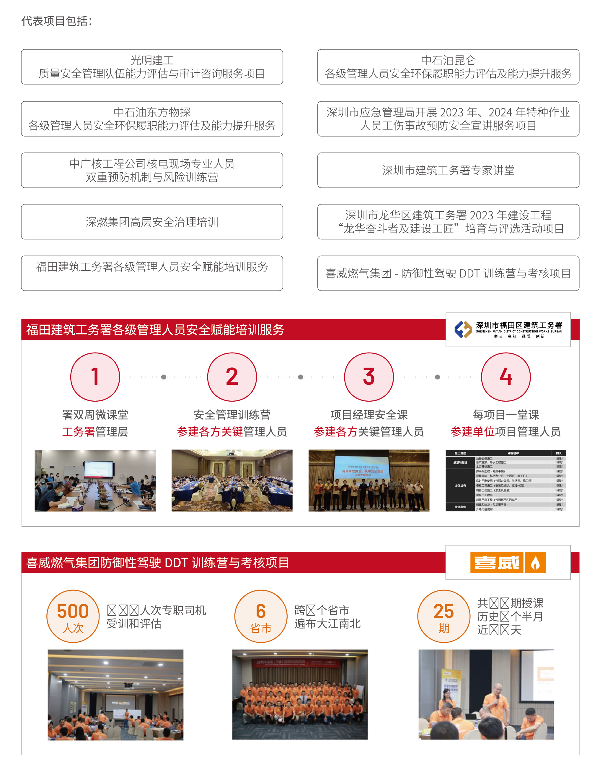 为优化业务HSE岗位人力资源配置,提升HSE管理水平,提供人员HSE能力素质评估及培养体系建设服务。通过对HSE管理人员、专业工程师及基层责任人等关键岗位开展任职资格测评,找出短板及薄弱环节,策划HSE能力素质提升方案,采取HSE管理培训课程体系建设、线上及线下培训等手段,提升人员HSE综合素质与技能水平。