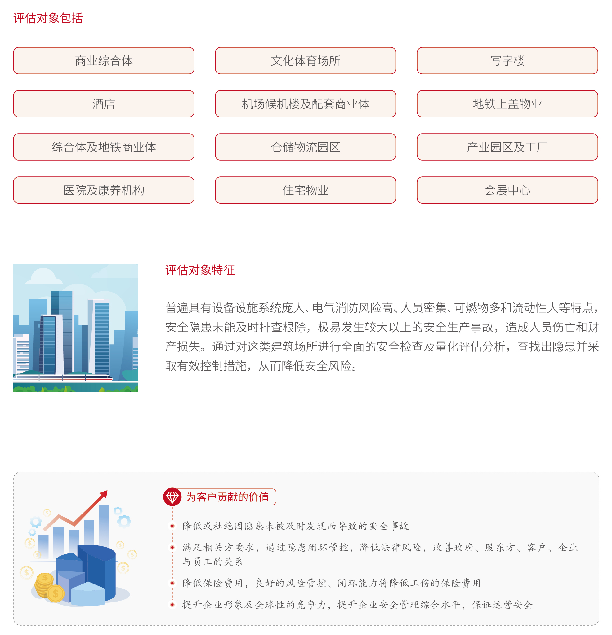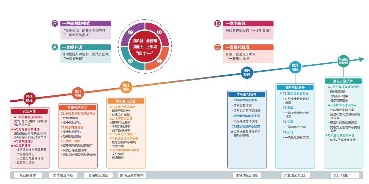 项目量化安全评估服务,指的是针对在营的商物业项目、住宅物业项目、产业/物流园区等开展全面的安全检查评估,通过科学量化的评估体系,考虑各分项的风险程度,对各检查项目进行权重赋值,科学量化项目的综合安全指数,从而为项目的运营安全提供决策指引,保障运营项目安全风险降低、平稳有效运营。