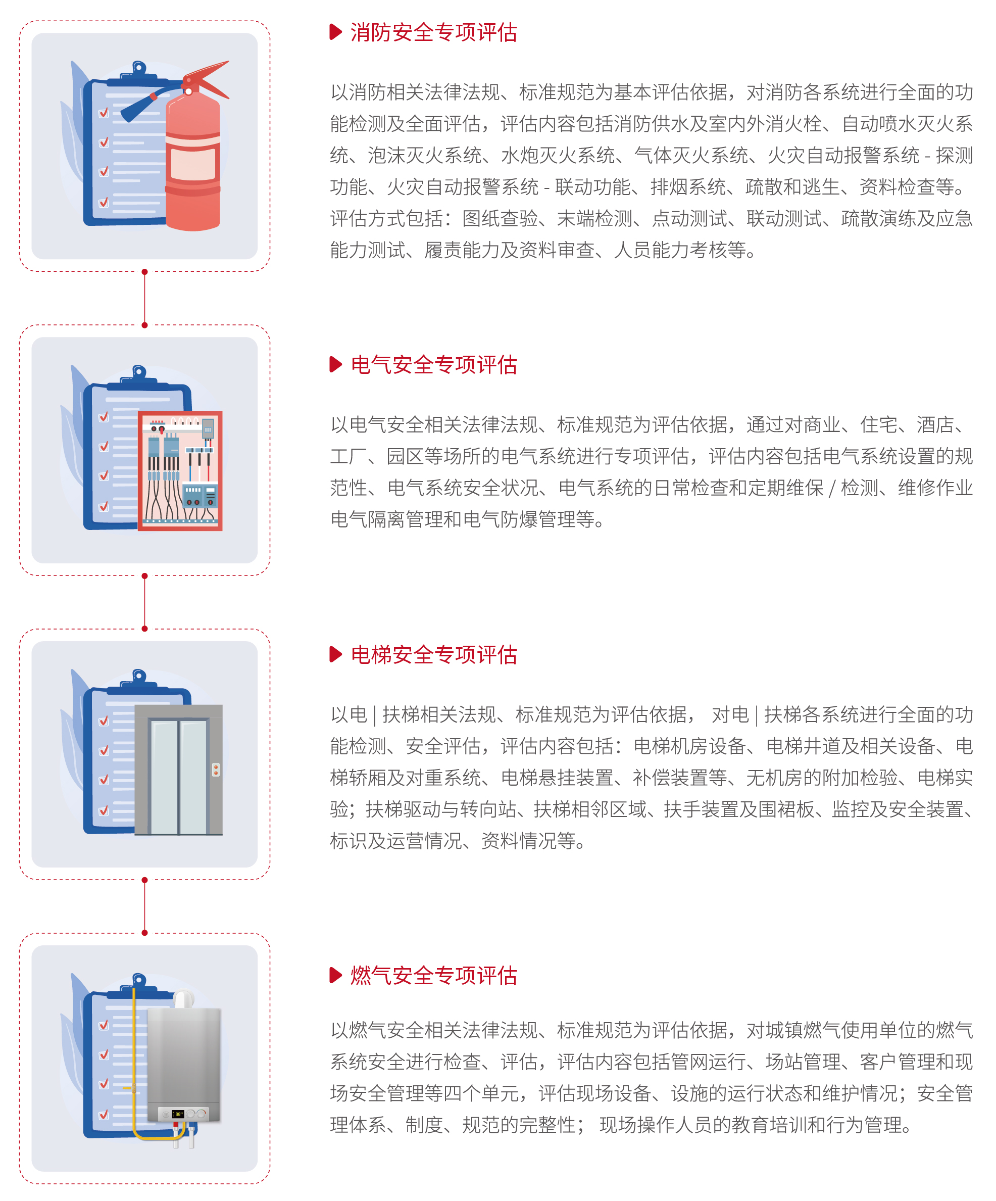 专项评估分为消防安全专项评估、电气安全专项评估、电梯安全专项评估、燃气安全专项评估等。