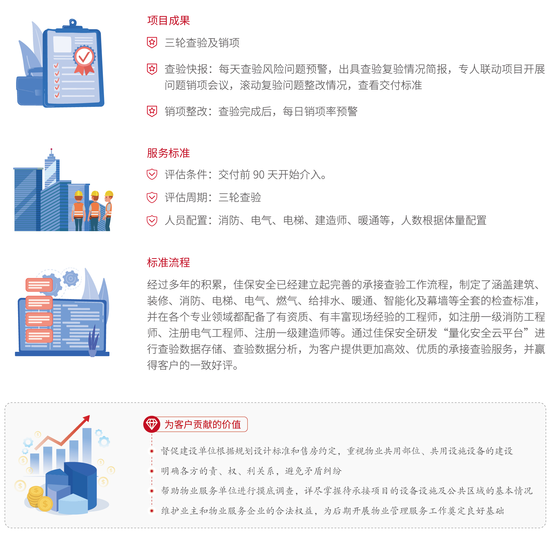 | 专业覆盖 | 风险预判 | 整改销顼 | 盲区管控 | 完美交付 |