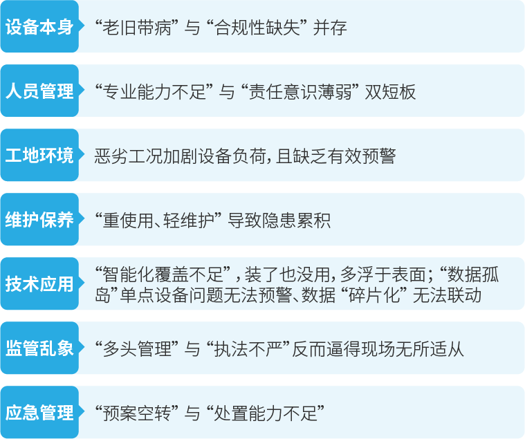 工地大型设备(如塔吊、施工电梯、履带吊、混凝土泵车等)的安全管理直接关系到施工人员生命安全与项目推进效率,但其管理过程中常面临多维度痛点,部分问题因涉及制度、技术、人员、环境等复杂因素,解决难度较大: