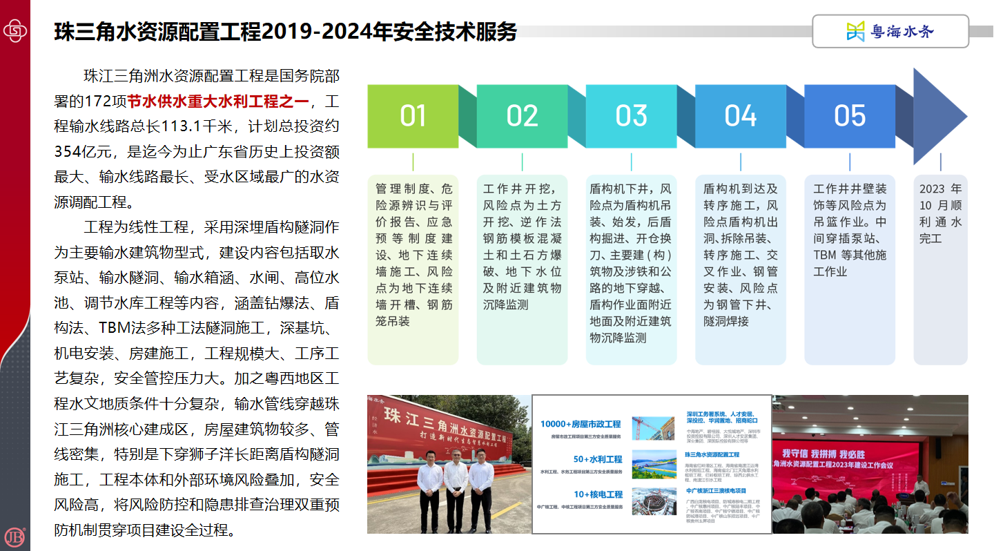 珠江三角洲水资源配置工程是国务院部署的172项节水供水重大水利工程之一,工程输水线路总长113.1千米,计划总投资约354亿元,是迄今为止广东省历史上投资额最大、输水线路最长、受水区域最广的水资源调配工程。 工程为线性工程,采用深埋盾构隧洞作为主要输水建筑物型式,建设内容包括取水泵站、输水隧洞、输水箱涵、水闸、高位水池、调节水库工程等内容,涵盖钻爆法、盾构法、TBM法多种工法隧洞施工,深基坑、机电安装、房建施工,工程规模大、工序工艺复杂,安全管控压力大。加之粤西地区工程水文地质条件十分复杂,输水管线穿越珠江三角洲核心建成区,房屋建筑物较多、管线密集,特别是下穿狮子洋长距离盾构隧洞施工,工程本体和外部环境风险叠加,安全风险高,将风险防控和隐患排查治理双重预防机制贯穿项目建设全过程。