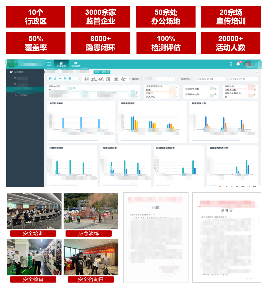 佳保安全为某市人力资源服务行业打造全流程、一体化安全生产服务体系,通过构建分级分类监管数据库、搭建数字化监管平台,依托双载体实现机构 “业务运营 + 安全生产监管” 一体化,让监管数据与业务信息精准关联、动态同步,最终构建 “科技化监管、专业化服务、企业化自治” 的安全生产治理新格局。项目服务覆盖全市 10 个行政区、3000 余家监管企业、50 余处办公场地,累计完成 8000 + 条隐患闭环治理、20 余场宣传培训活动,覆盖人群超 20000 人次,圆满完成全周期监管支撑与行业安全提升服务目标。