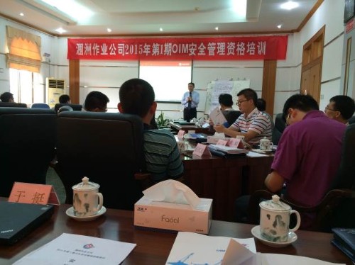 2015年5月11日-16日,佳保安全培训团队组织了为期5天的第1期OIM培训课程,参加培训人员主要包括某作业公司油田总监、安全监督、生产监督、平台长等;培训内容主要包括企业安全文化建设、OIM及其职权、应急管理与应急处置、承包商管理、作业控制、典型事故案例分析等。