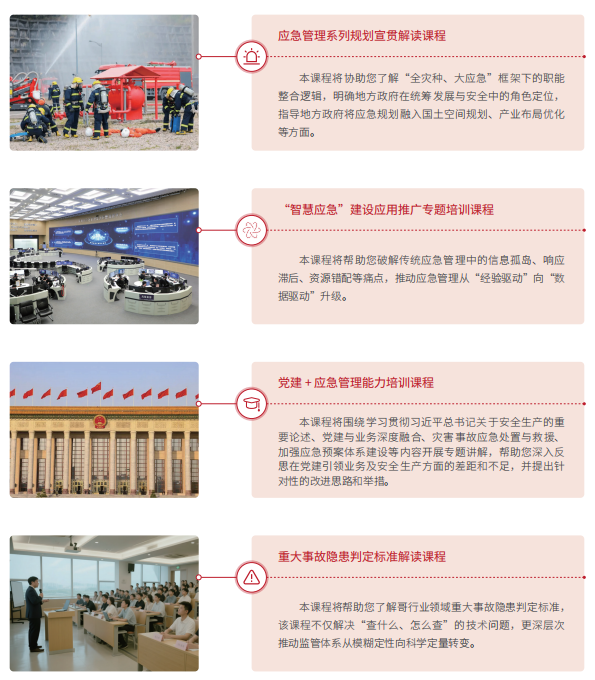 紧密围绕政策时事与治理需求,为学员提供从战略理解到执行落地的全链条价值赋能,帮助学员在政策浪潮中锚定航向,在技术变革中掌握先机,在复杂监管中筑牢底线,最终实现从 “安全生产守护者” 到 “城市安全设计师” 的角色升级,为推进国家治理体系和治理能力现代化贡献专业力量。